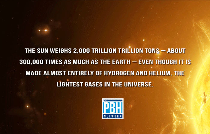 The Sun weighs 2,000 trillion trillion tons – about 300,000 times as much as the Earth – even though it is made almost entirely of hydrogen and helium, the lightest gases in the universe.